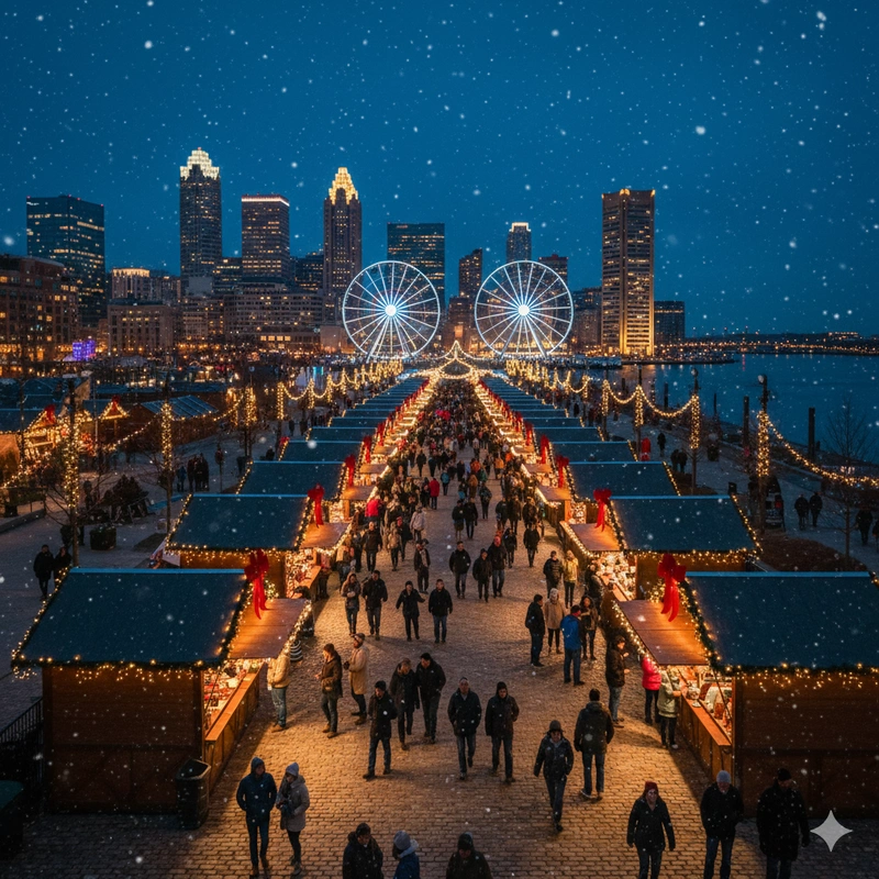 Baltimore’s Inner Harbor transforms into Christmas Village each December, where European-style vendor huts sell gifts, decorations, and seasonal treats with waterfront views.