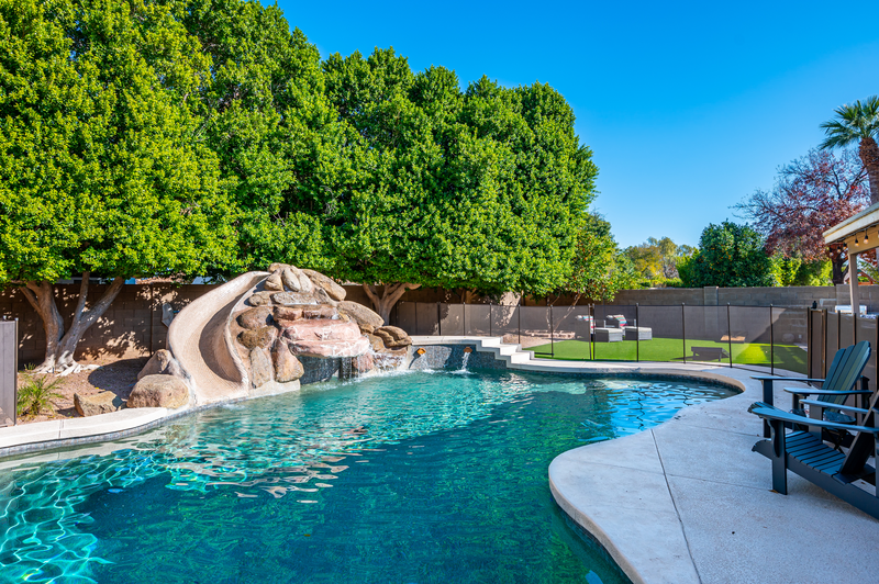 Why This House is Fun: The spectacular swimming pool with rock waterfalls becomes the entire entertainment center during hot Arizona days. Kids can spend morning to evening swimming, playing pool games, and enjoying that vacation feeling.