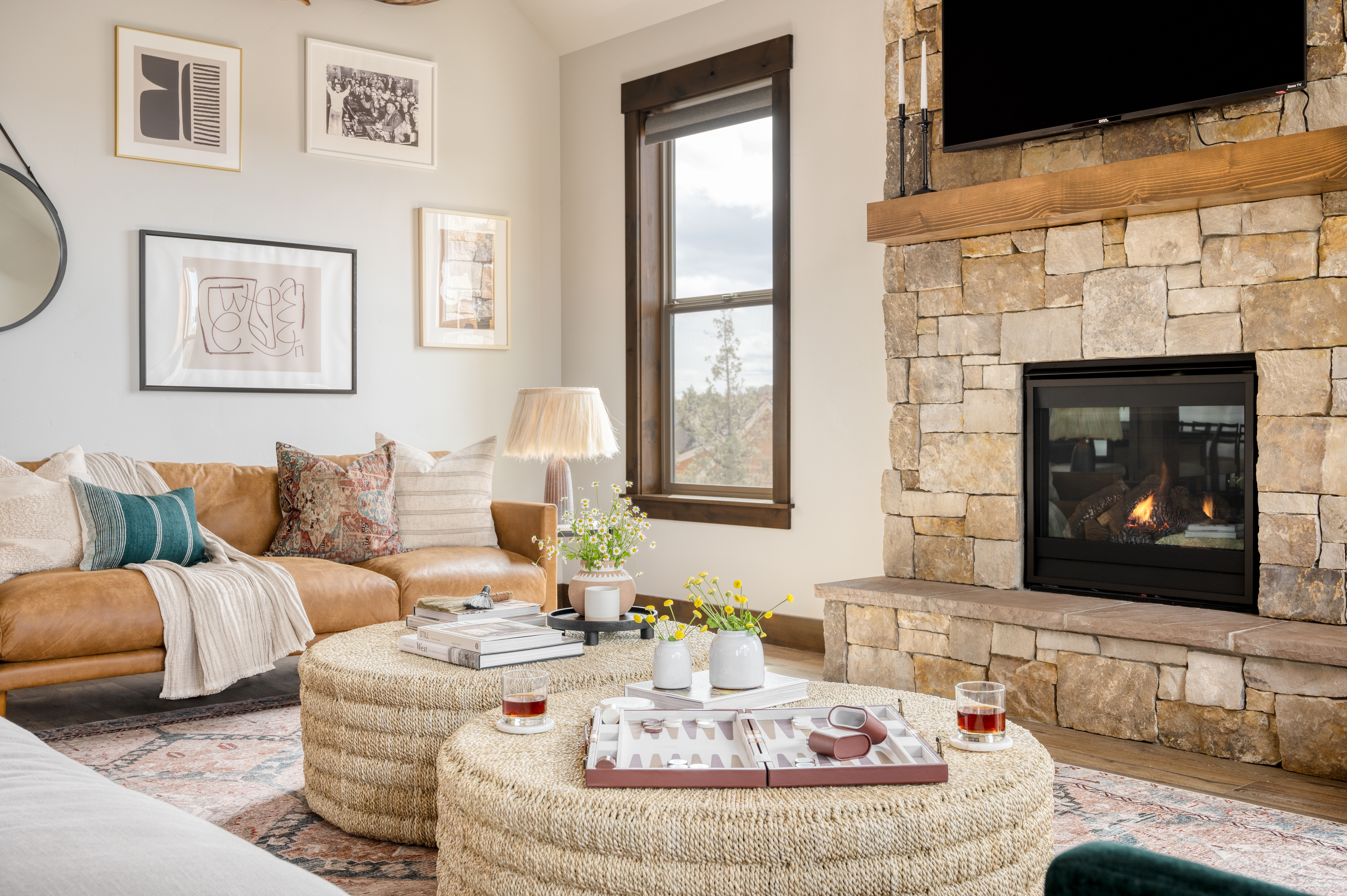 This isn’t your average cabin. Teddy features vaulted wood ceilings, floor-to-ceiling windows flooding the space with natural light, and an open floor plan connecting the kitchen, dining, and living areas.